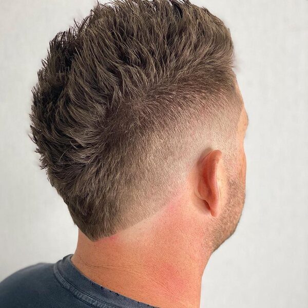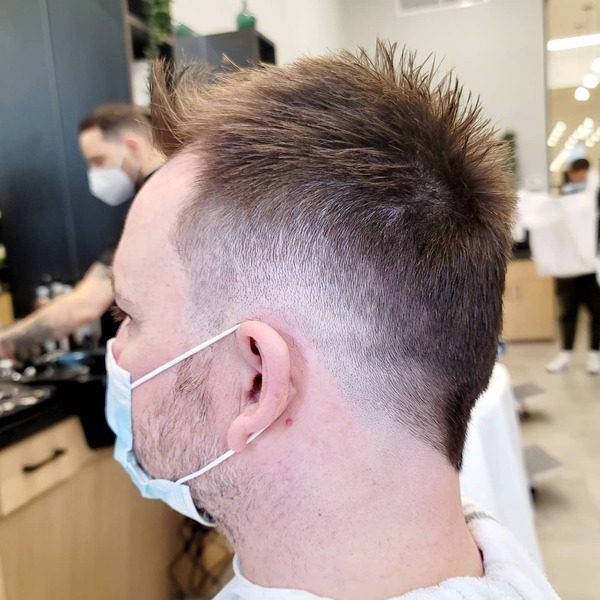 Denne stilen er en annen pigget faux Hawk -stil du kan velge mellom. Han har lagt til en lav fade som møtes i ryggen i en V-formkant. Denne typen frisyrer er så allsidig fordi du kan bruke den hvor som helst fra styremøtet til treningsstudioet, og du vil alltid se bra ut.