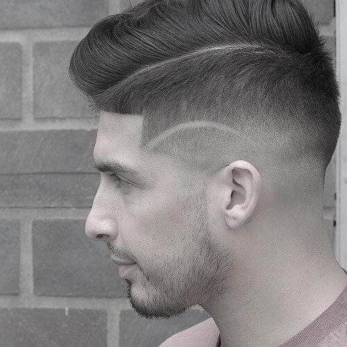 Aunque se ve complejo, este corte de pelo es fácil de lograr. Una base de corte de zumbido adornada con algunos patrones definidos de navaja de afeitar y la parte superior del Pompadour es perfecta para el hombre del estilo.