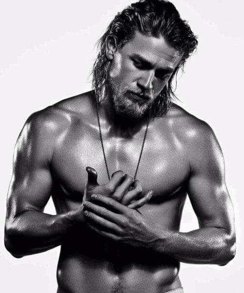 Cabelo loiro e barba? Sim por favor. Penteados médios para homens que podem mostrar essa combinação? Sim por favor. Charlie Hunnam? Onde assinamos? Lembre -se de estocar o gel de cabelo se você tiver sua mente com essa aparência molhada. Um visual sexy e sedutor que as mulheres certamente adoram.