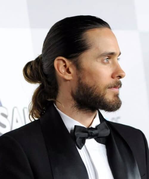 De longe, um dos homens mais bonitos do mundo, Jared Leto pode confiar em saber uma coisa ou duas sobre penteados médios para os homens. Aqui está ele com uma penteada lisa e um pão de homem baixo em um evento de tapete vermelho, onde ele também está exibindo um smoking.
