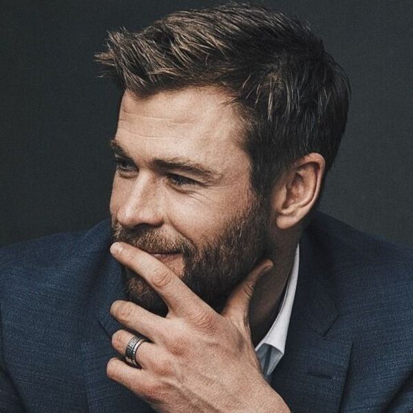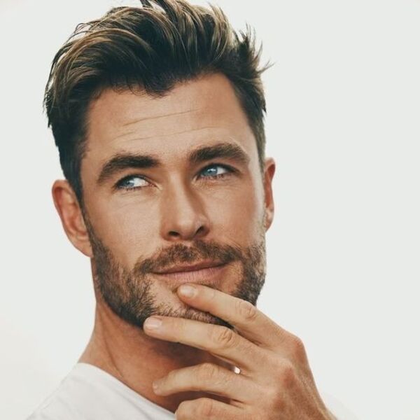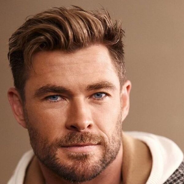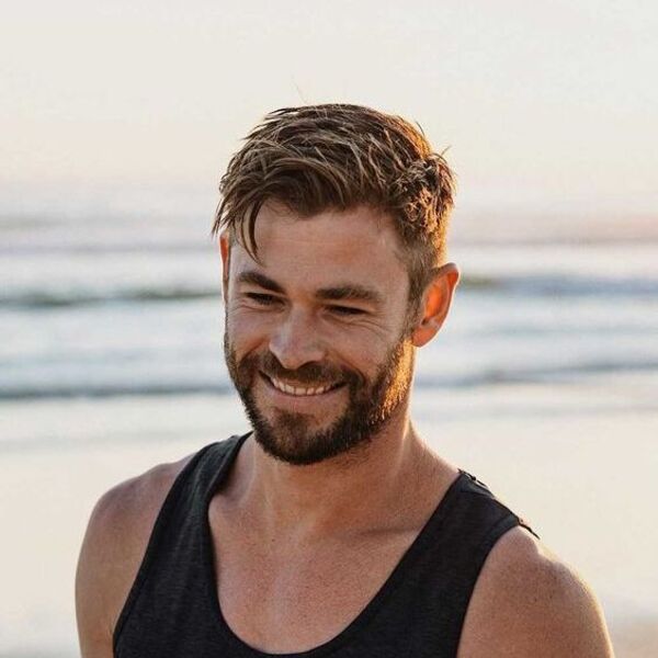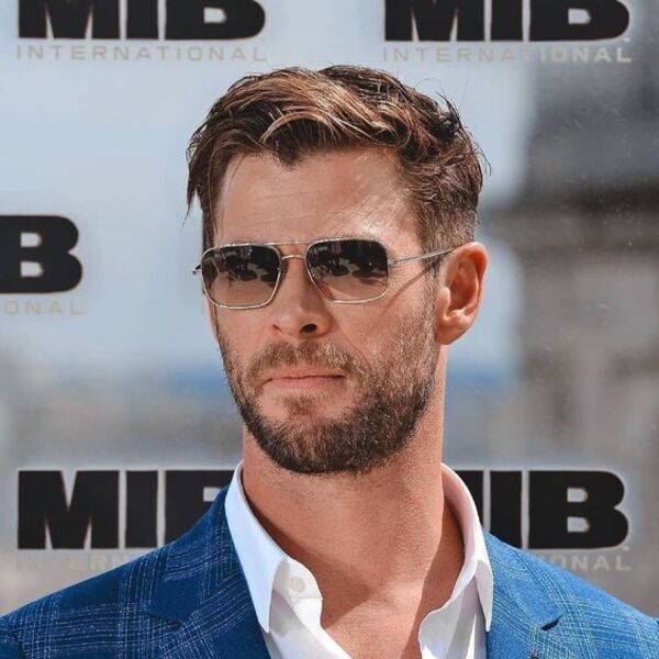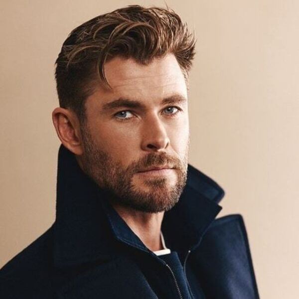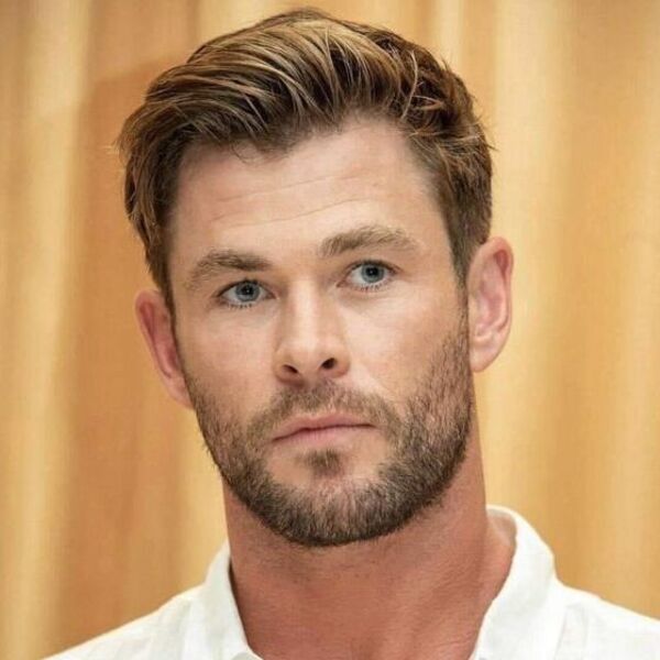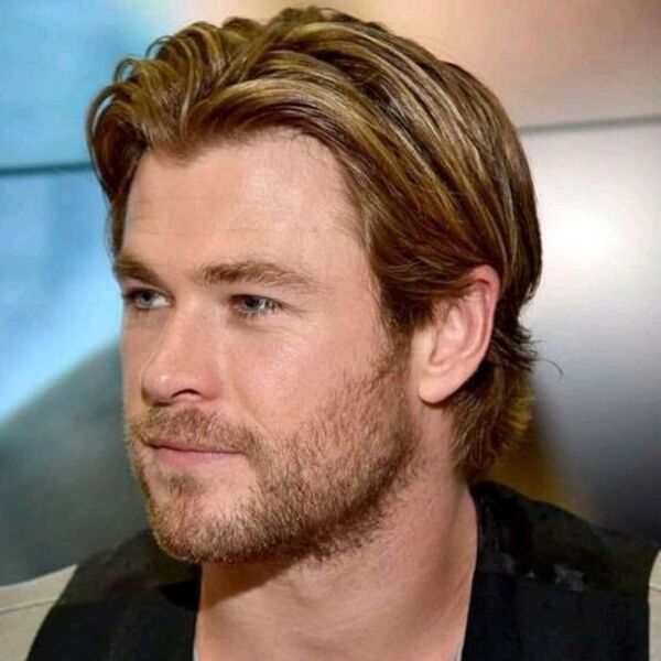 Următorul este o nuanță mai închisă decât Chirs obișnuit să poarte. Acest stil se numește un aspect mediu măturat, deoarece are părul lung periat în lateral. De asemenea, a împerecheat acest aspect întunecat cu o barbă scurtă și pare uimitor. Asigurați -vă că vă tăiați bine părul facial, astfel încât să completeze coafura superioară.