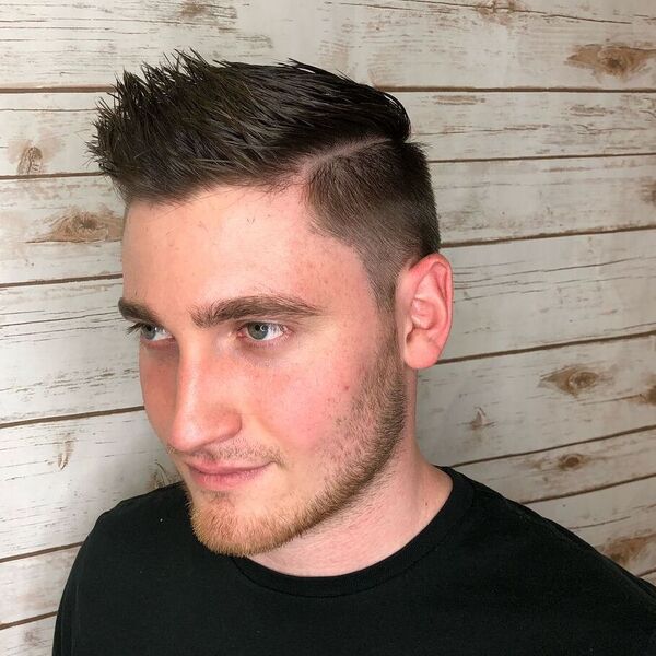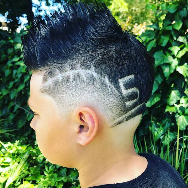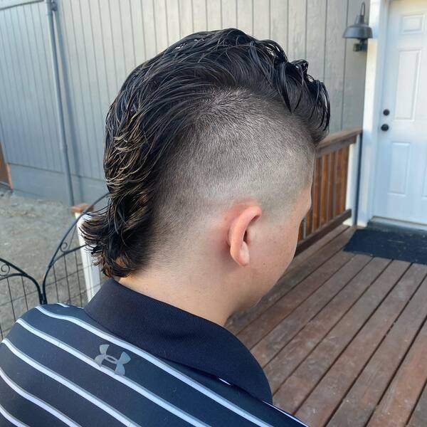 En slicked-back Mohawk är ett perfekt sätt att ta med denna populära 90-tals frisyr för män in i 2000-talet. På bilden ovan har de också lagt till en kort underskidning med en design rakad på sidan. För att göra den här frisyren till din egen, kom med din design för att lägga till underskärningen.