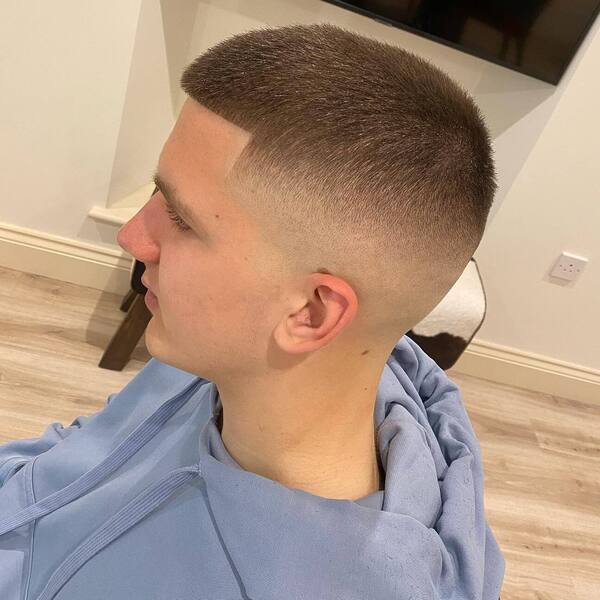 Här är ett stiligt exempel på en besättning som är klippt med låg blekning. Denna frisyr för män håller sidorna jämnt och rakade ner och den översta tillräckligt länge för att borsta ner. Försök att lägga till din favorithårprodukt så att din stil förblir färsk hela dagen.