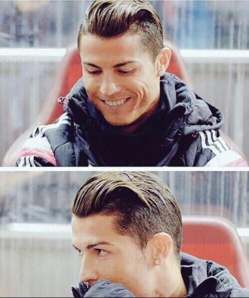 Bortsett från att slicka det hela tillbaka när han har vanat oss, kan Cristiano också kamma håret till ena sidan till en mycket vacker fjäderig väv. Det förlänger profilen i ansiktet och får honom att se ännu smalare ut än han redan är.