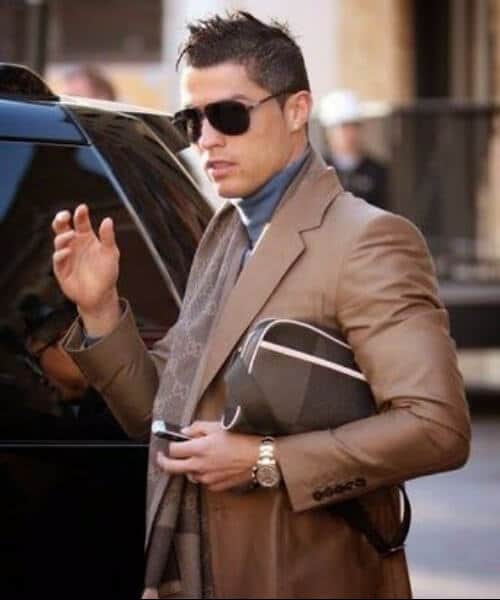 Att matcha din frisyr till din outfit är alltid en bra idé, och det är precis vad Cristiano gjorde här. Han ser oerhört elegant ut i sin kameljacka, blå sköldpaddahals och grå halsduk och det gör också håret.