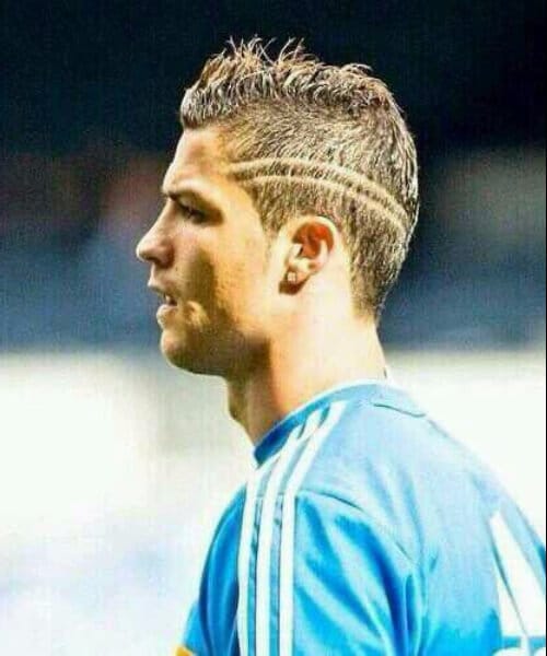 Ronaldo är också mycket förtjust i hårdesignlinjemönster i hårbotten. Med andra ord, han älskar att klippa håret mycket kort och sedan låta hans frisör skapa olika mönster i håret. Här har han en stor linje som går över hela huvudet och fyra mindre på sidan.