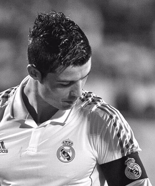 Detta svartvita foto av detta Cristiano Ronaldo -frisyr visar oss hur yngre en stor frisyr kan få dig att se ut. Här ser han ut som en tonåring tack vare sina korta, gelade spikar och rakade sidor.
