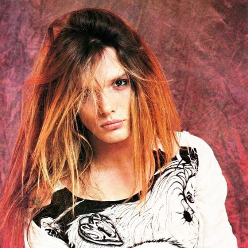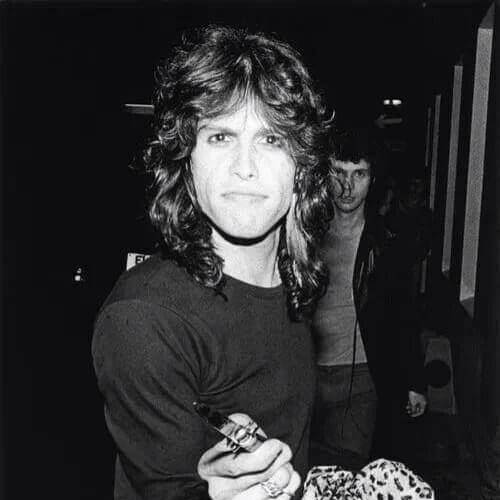 Låt oss fortsätta vår resa ner Rocker Alley med Aerosmiths Steven Tyler. Detta är ett foto från hans yngre dagar med bandet när han brukade sport lockiga axellånga tresses och en uppsättning lugg skilda i mitten.