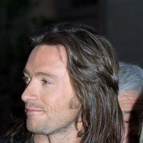 Om du någonsin undrat hur Hugh Jackman skulle se ut med långt hår, är det här. Han sportar en klassisk 90 -tals frisyr med skiktade lugg som skildes ner i mitten och svepte åt sidan som gardinen hans ansikte.