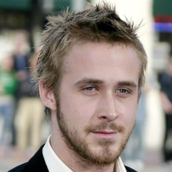 Denna framslickade frisyr är ett bra exempel på en spiky Ryan Gosling-inspirerad frisyr. Jordbruna och blonda paletten kan utformas för att matcha perfekt med din hudton.