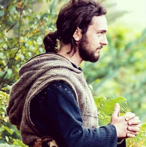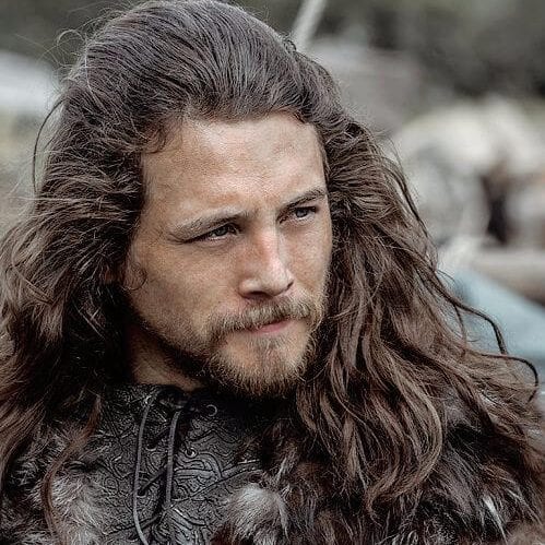 Här är en annan karaktär från Vikings TV -program, Earl Kalf, och han bär håret i en helt annan stil än väntat. Dessutom har han långt, brunt och läckert hår som han slickar tillbaka i en halv-up, halv ner hästsvans.