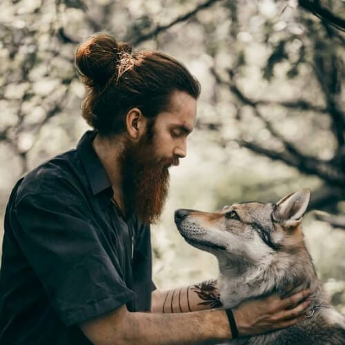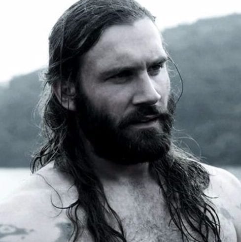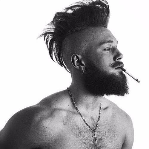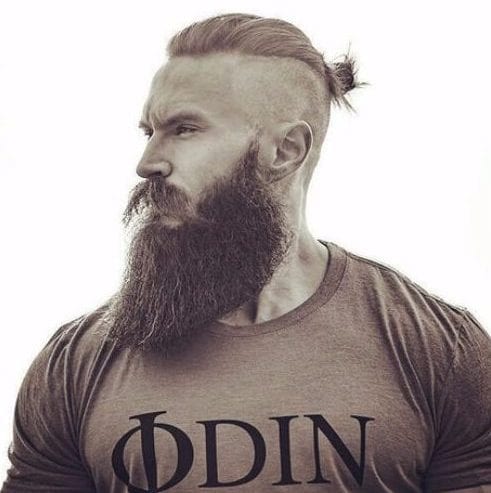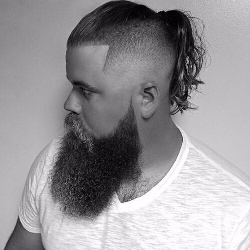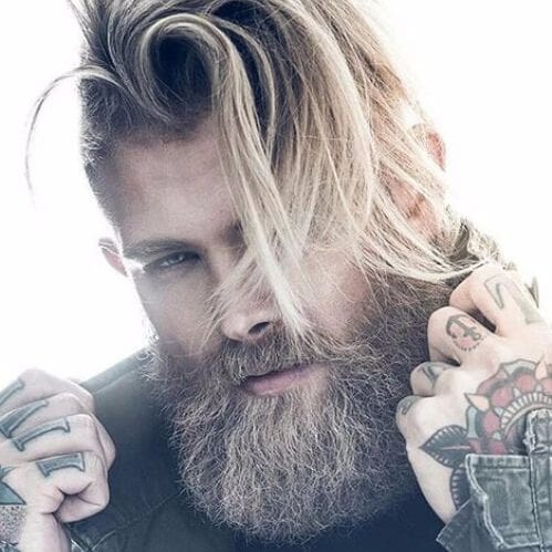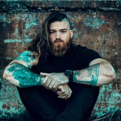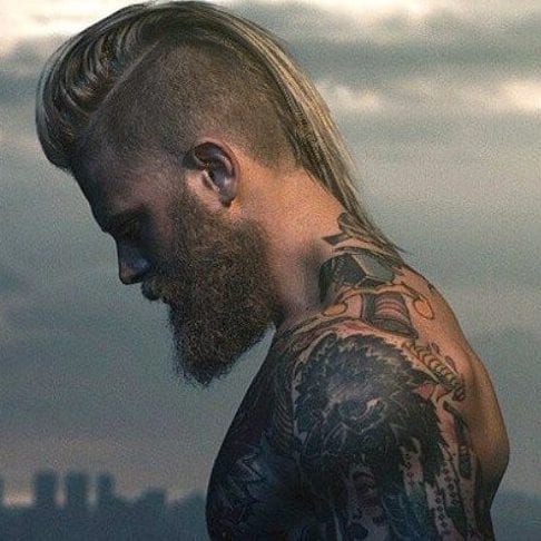 Detta kan bara vara definitionen av en mans man, när det gäller många människor. T-tröjan, med metallkedja och ärm tatueringar fungerar perfekt med de korta sidorna och asymmetriska långa toppvikingfrisyr som också hjälper till att uppmärksamma hela skägget.