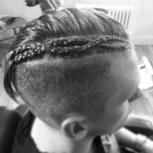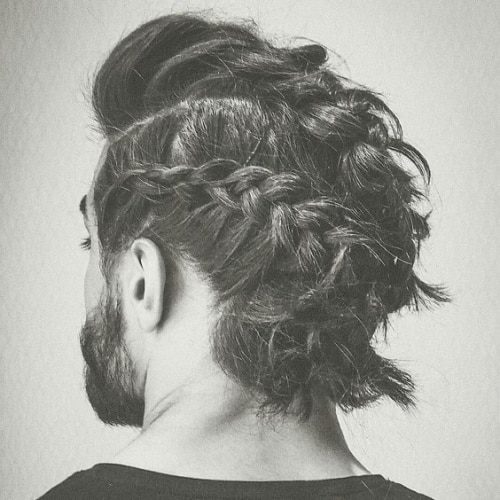 På tal om flätor för män och vikingfrisyrer, här är ett intressant sätt att blanda dem. Använd de långa lockarna för att skapa en fläta från huvudet från huvudet. Detta kommer att ge en illusion av en mohawk utan att behöva raka sidorna på huvudet.