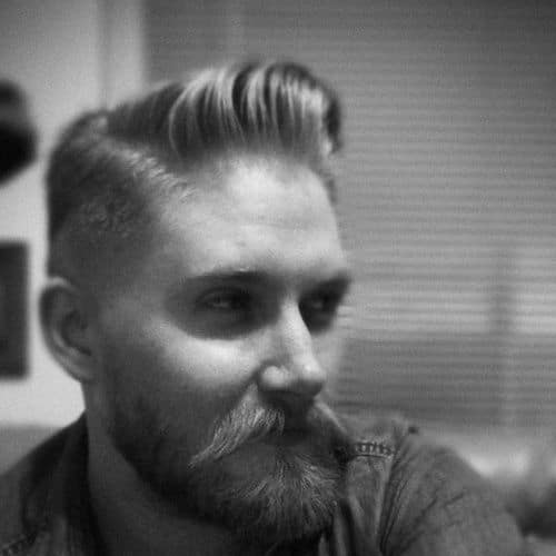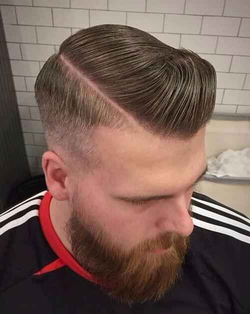 Bu, modern ve klasik stillerin kesinlikle harika bir kombinasyonudur. Temiz bir yan ayrılık ve daha uzun tarafta bir tarama ile geleneksel bir askeri saç kesiminden oluşur. Yüksek kaliteli ürünler kullanılarak saçın nasıl mükemmelliğe çırpıldığını görün. Resimdeki model ayrıca kaba ve sağlam bir görünüm için mükemmel olan kısa bir oduncu sakalına sahiptir.