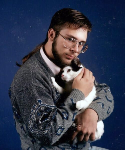 Зараз це може здатися занадто великим, але в 80 -х роках це був стандартний портрет. Фон, густа перемичка та величезні окуляри були втіленням моди. Очевидно, ви можете побачити стрижку, яка стосується вечірки в задній частині, бізнесу на фронті. Кіт - це просто бонус.